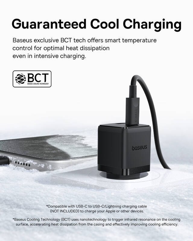 Díky technologii Baseus BCT (Baseus Cooling Technology) automaticky reguluje teplotu pro bezpečné a stabilní nabíjení i při vysokém zatížení.