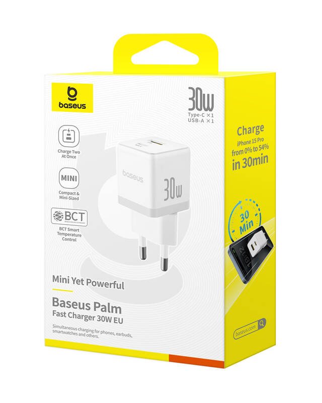 Baseus Palm je rychlonabíječka s výkonem až 30 W a dvěma výstupy (USB-A a USB-C), ideální pro efektivní nabíjení smartphonů, tabletů a dalších zařízení.