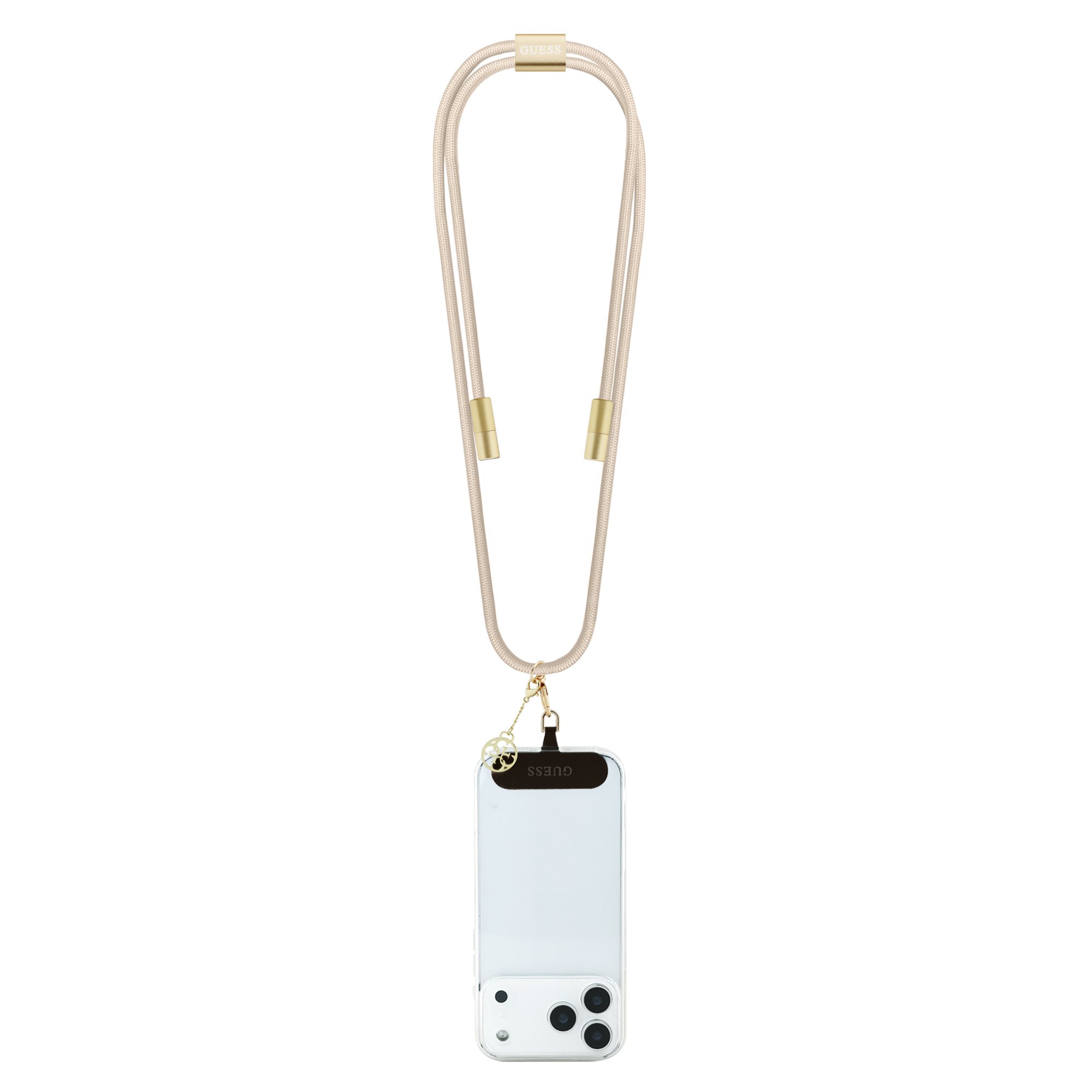 Guess popruh z vysoce kvalitního nylonu s univerzálním upevněním pod zadní kryt telefonu, doplněný o integrovaný nabíjecí kabel.