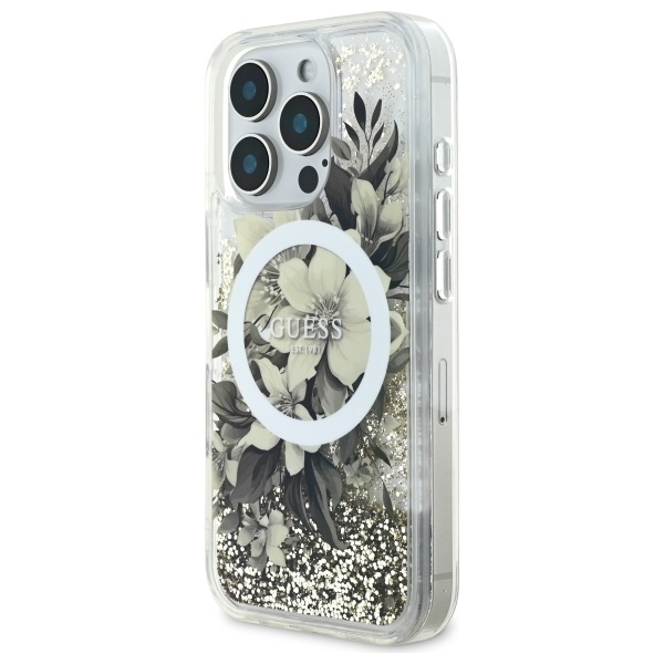 Guess GUHMP16LLFMWTE Beige Hardcase Liquid Glitter Flower MagSafe Kryt iPhone 16 Pro