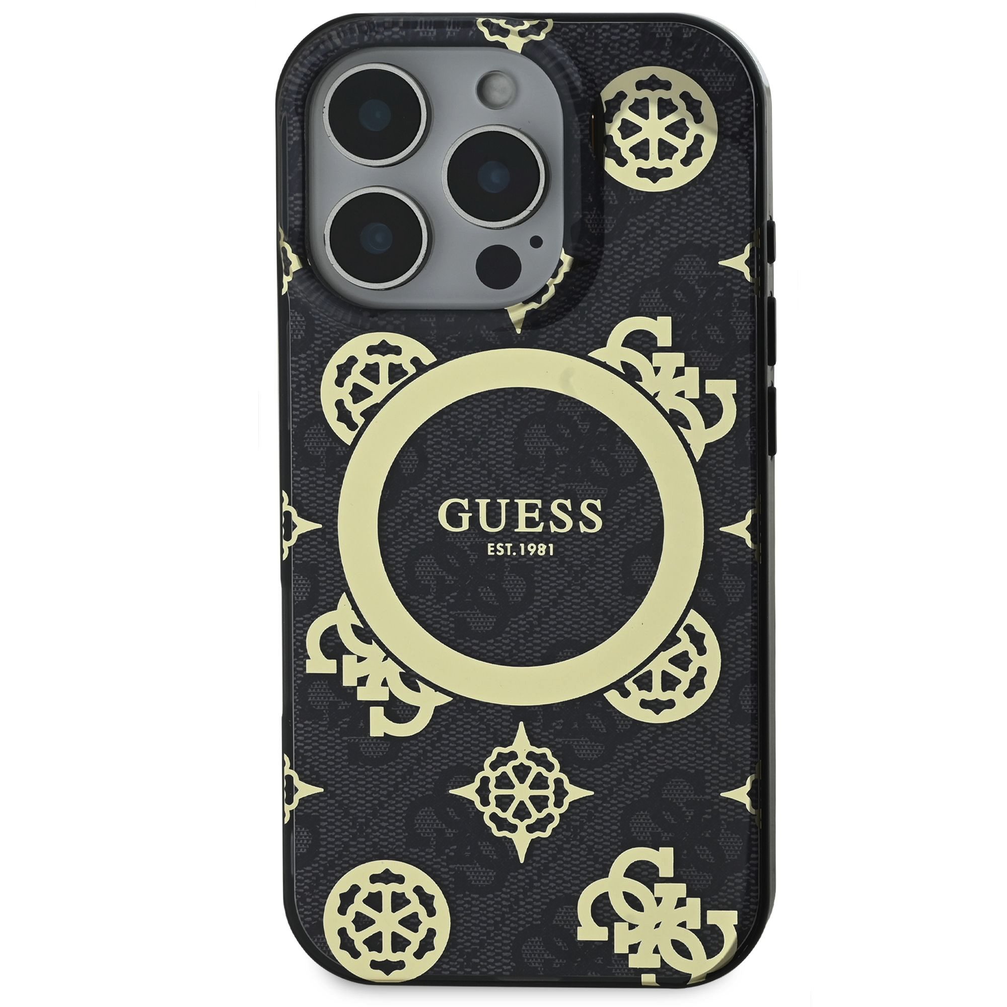 Design krytu vyniká logem Guess ve zlatém kruhu a motivem 4G Peony na pozadí, což z něj činí nejen praktický, ale i stylový doplněk, který skvěle doplní váš outfit.