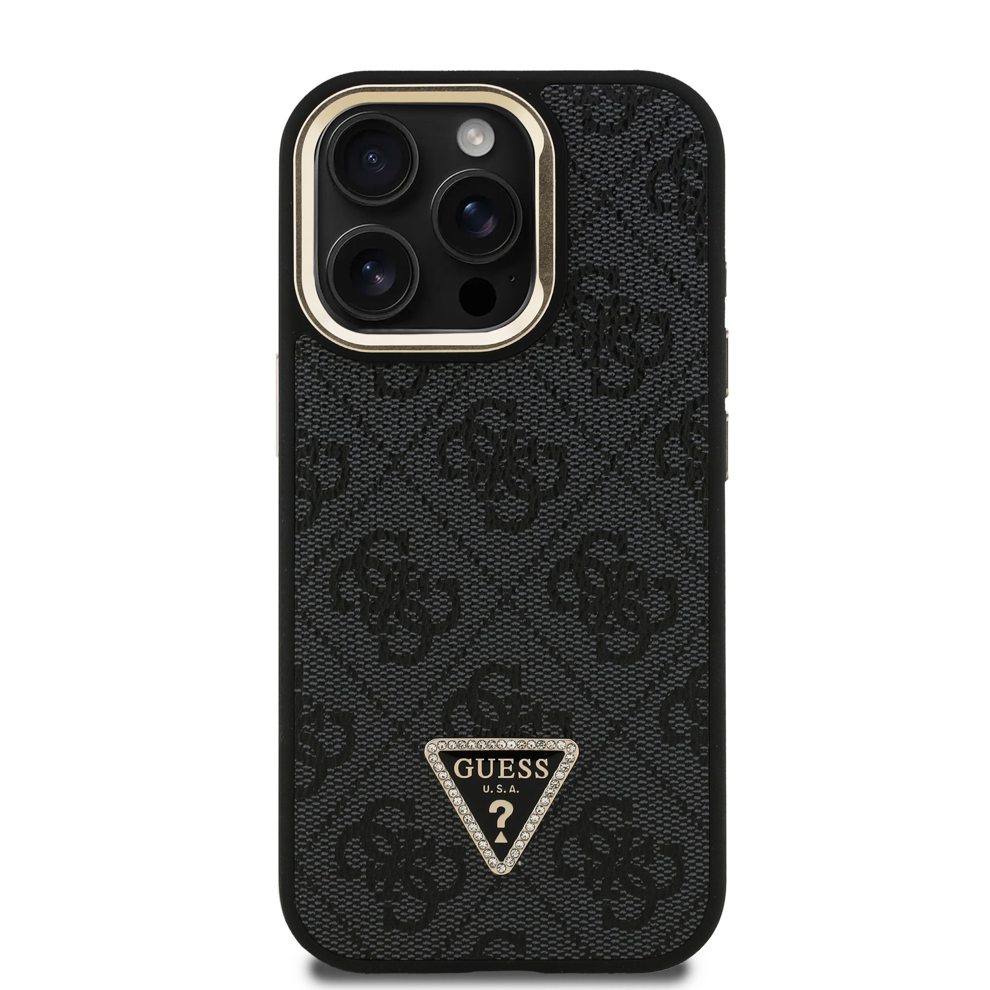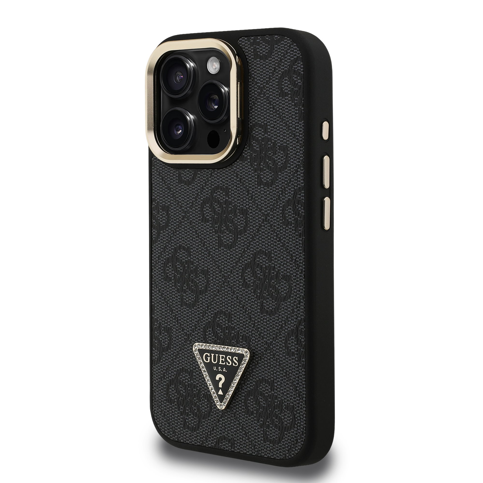 Guess PU 4G Strass Triangle Logo Stand Camera Frame MagSafe Black Kryt iPhone 15 Pro Max