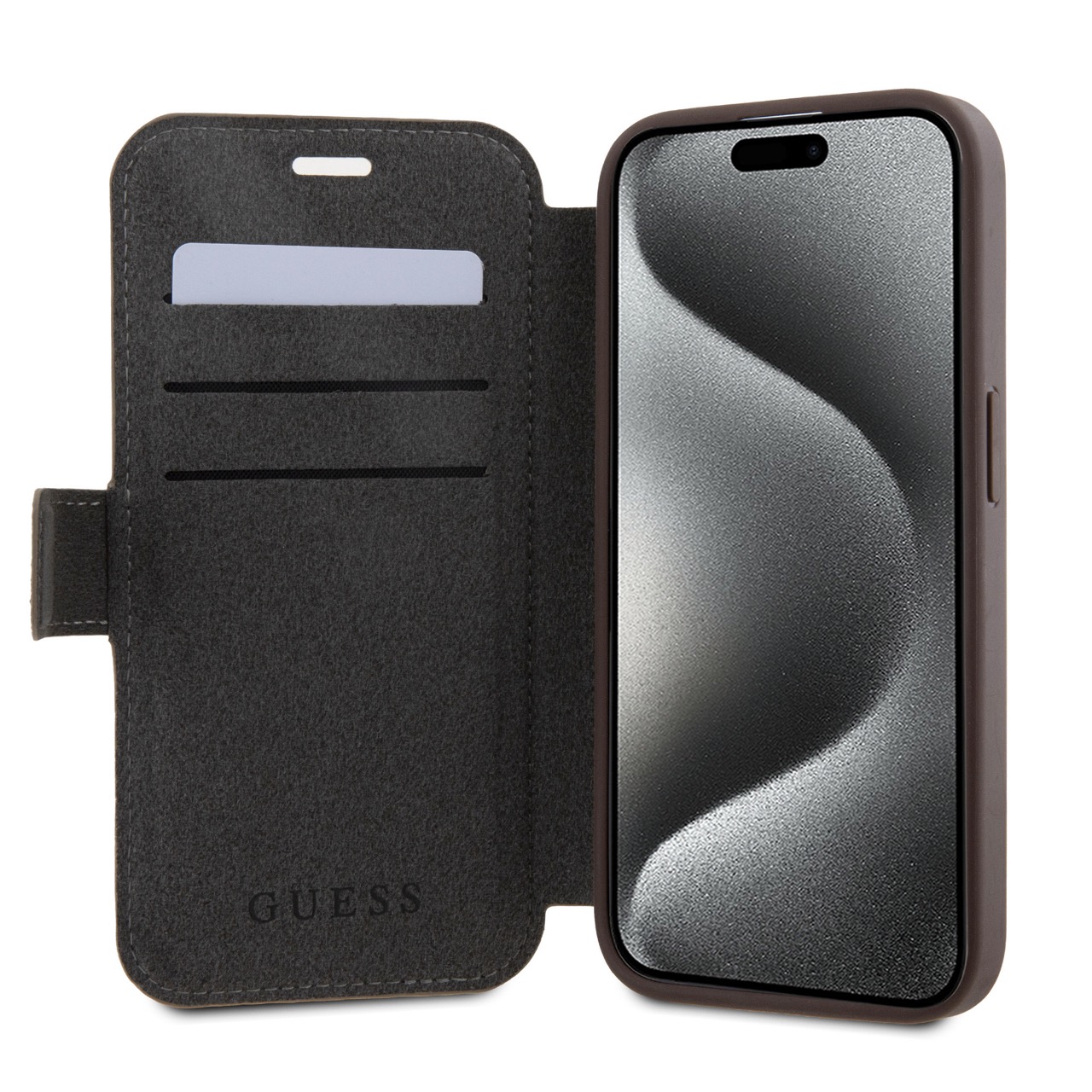 Guess PU Leather 4G Metal Logo Book Brown Kryt iPhone 15 Pro