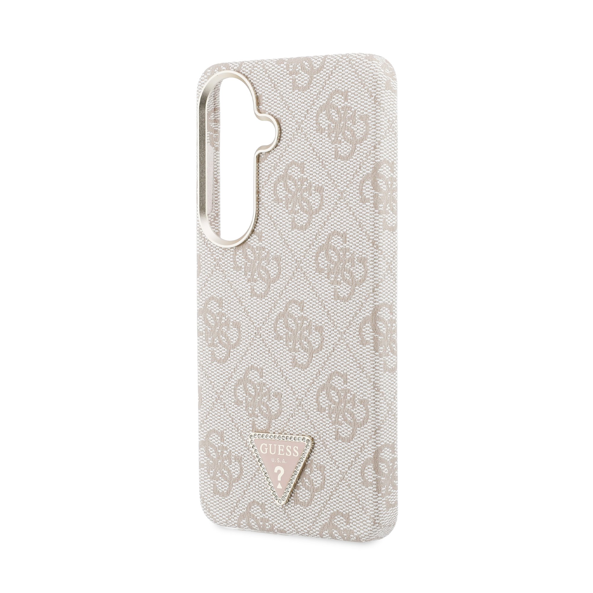 Guess PU Leather 4G Strass Triangle Logo Gold Frame zadní kryt je dokonalý doplněk pro váš telefon i váš outfit, který kombinuje funkčnost a styl v jednom.