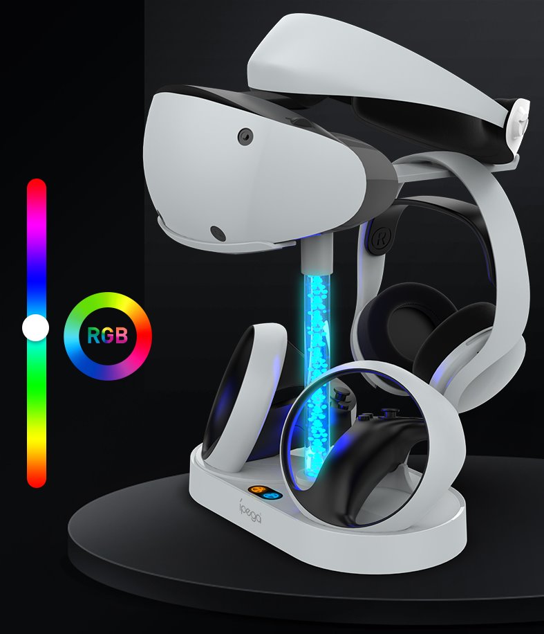 iPega Multifunkční nabíjecí stojan pro PlayStation VR2 ovladače a odkládací místo pro VR2 Brýle a Vaše sluchátka.