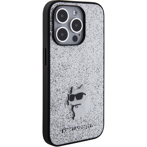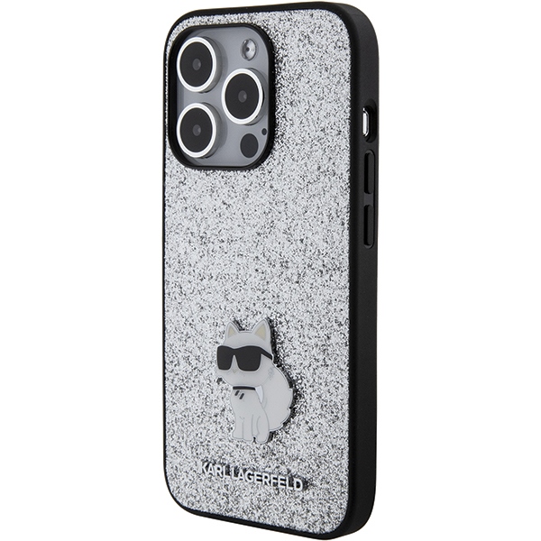 Karl Lagerfeld KLHCP15LGCNPSG Silver Hardcase Fixed Glitter Choupette Logo Metal Pin Kryt iPhone 15 Pro