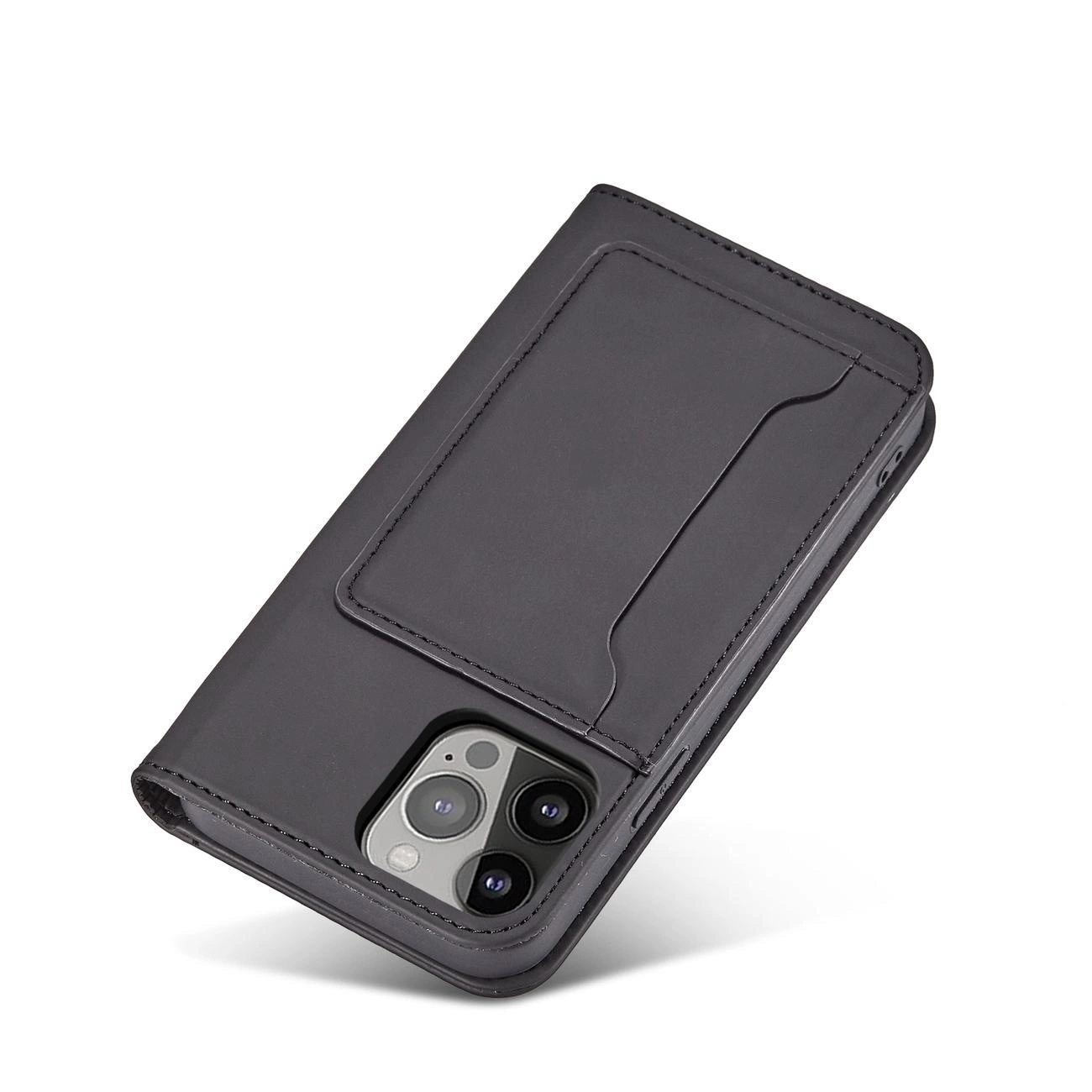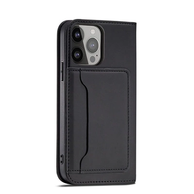 Obal Magnet Card Case pro iPhone 14 s otevíracím krytem s funkcí peněženky a stojánku v černé barvě