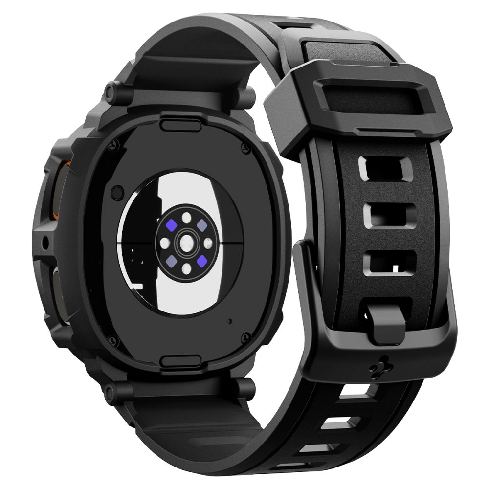 Pohodlný sportovní řemínek Spigen Rugged Armor „Pro“ vyrobený z flexibilního materiálu TPU, který je zdobený akcenty z karbonového vlákna. Obsahuje integrované pouzdro se zvýrazněnými okraji, které chrání pouzdro hodinek před poškrábáním a nárazy.