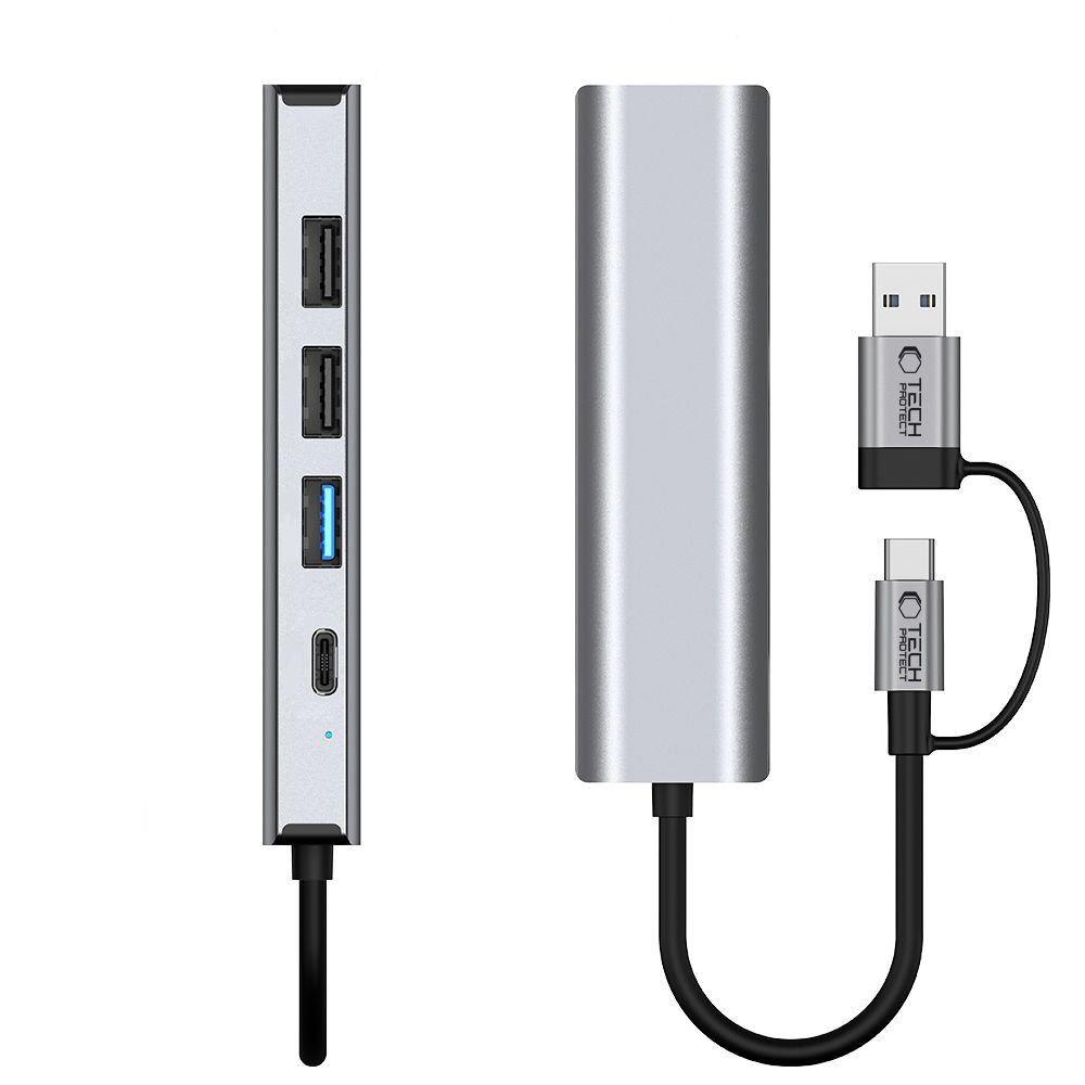 Tech-Protect HB03 HUB Adapter 5in1 je kompaktní, multifunkční zařízení vhodné pro všechny počítače s podporou portů USB-C a USB-A. Díky solidní konstrukci z hliníku a ABS je adaptér lehký, ale zároveň odolný vůči poškození a trvanlivý. Zařízení je vybaveno šesti porty, které nabízí různé funkce.